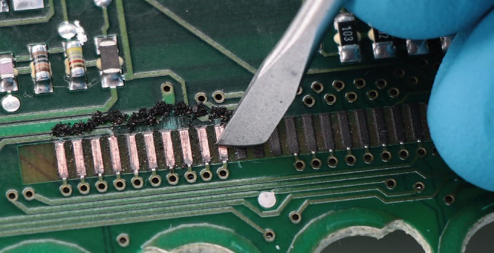You will notice that the contacts on the motherboard are covered with a graphite patina. To perfectly solder the FPC of the new display, the patina has to be carefully removed with a scraper. Clean any residues with some solvent.